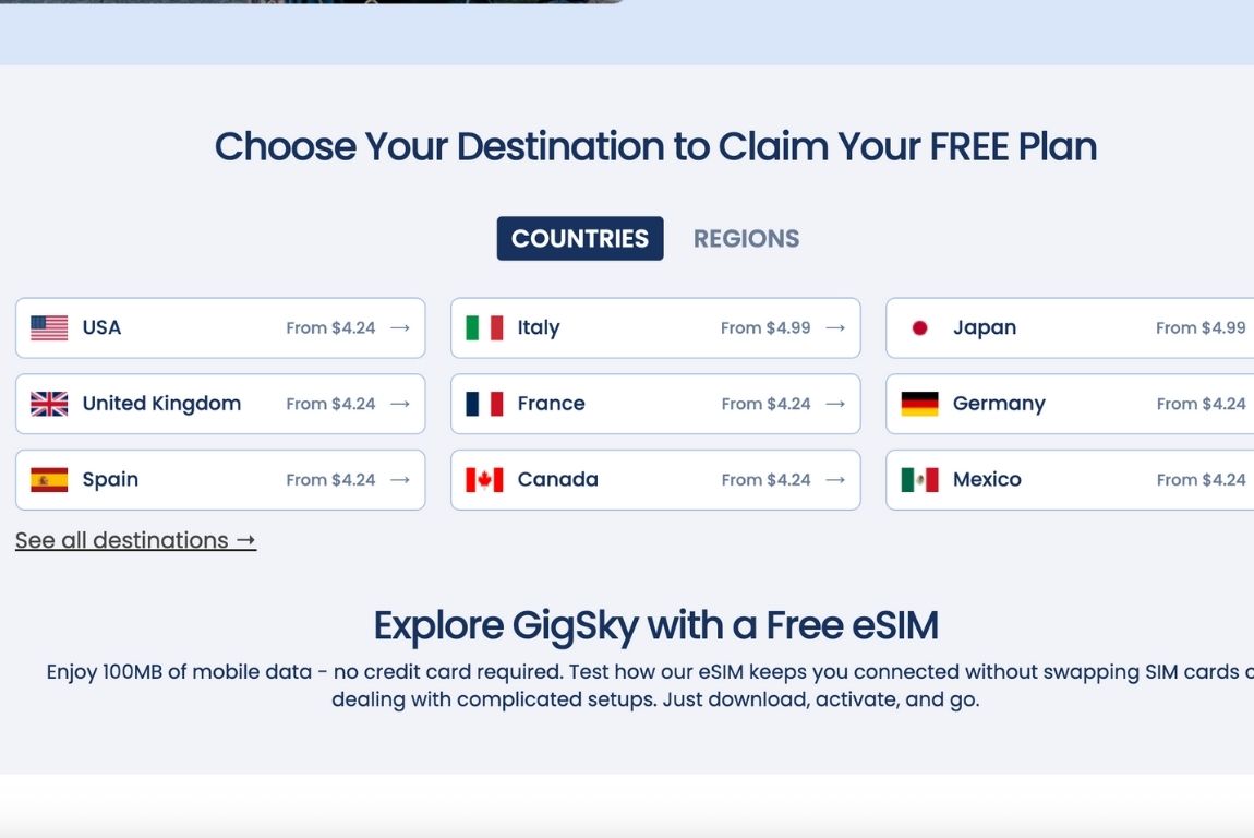 A versão de avaliação gratuita do eSIM da GigSky oferece um dos programas mais generosos do mercado de eSIM e, ao contrário de outros provedores que o limitam a um dia ou a alguns países, você pode testar o serviço em 175 países com permissões de dados que variam de 100 MB a 3 GB.