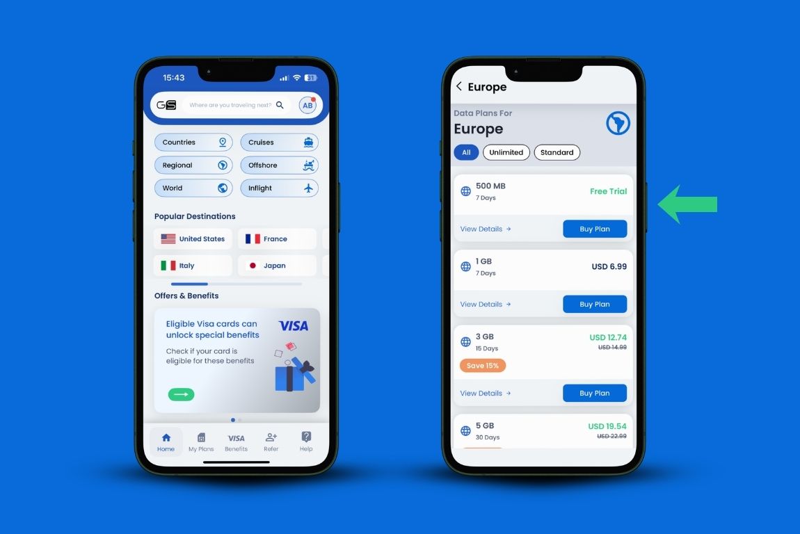 • 500 MB free for any traveler heading to Europe, no credit card needed. Redeem in-app by searching for Europe.